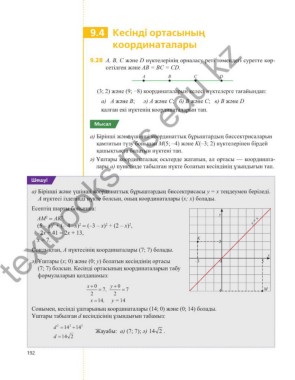 (7; 7) болсын. Кесінді ортасының координаталарын табу