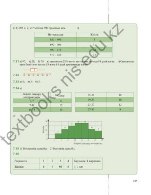 7.21 а) 97; ә) 25; б) 70. в) сыныптың 25%-ы сол тестте кем дегенде 85 ұпай алған. г) Сыныптың
