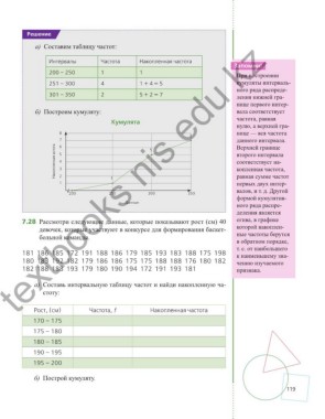 а) Составь интервальную таблицу частот и найди накопленную ча-