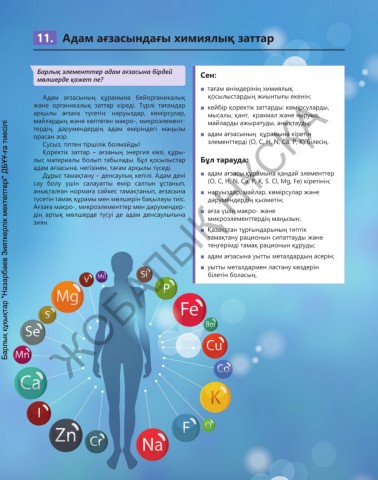 сау болу үшін салауатты өмір салтын ұстанып, (О, С, Н, N, Ca, P, K, S. Cl, Mg, Fe) кіретінін;