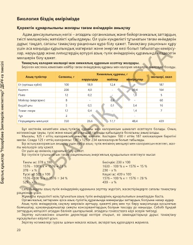 Бұл кестенің көмегімен азық-түліктің құрамы мен калориясын шамалап есептеуге болады. Оның